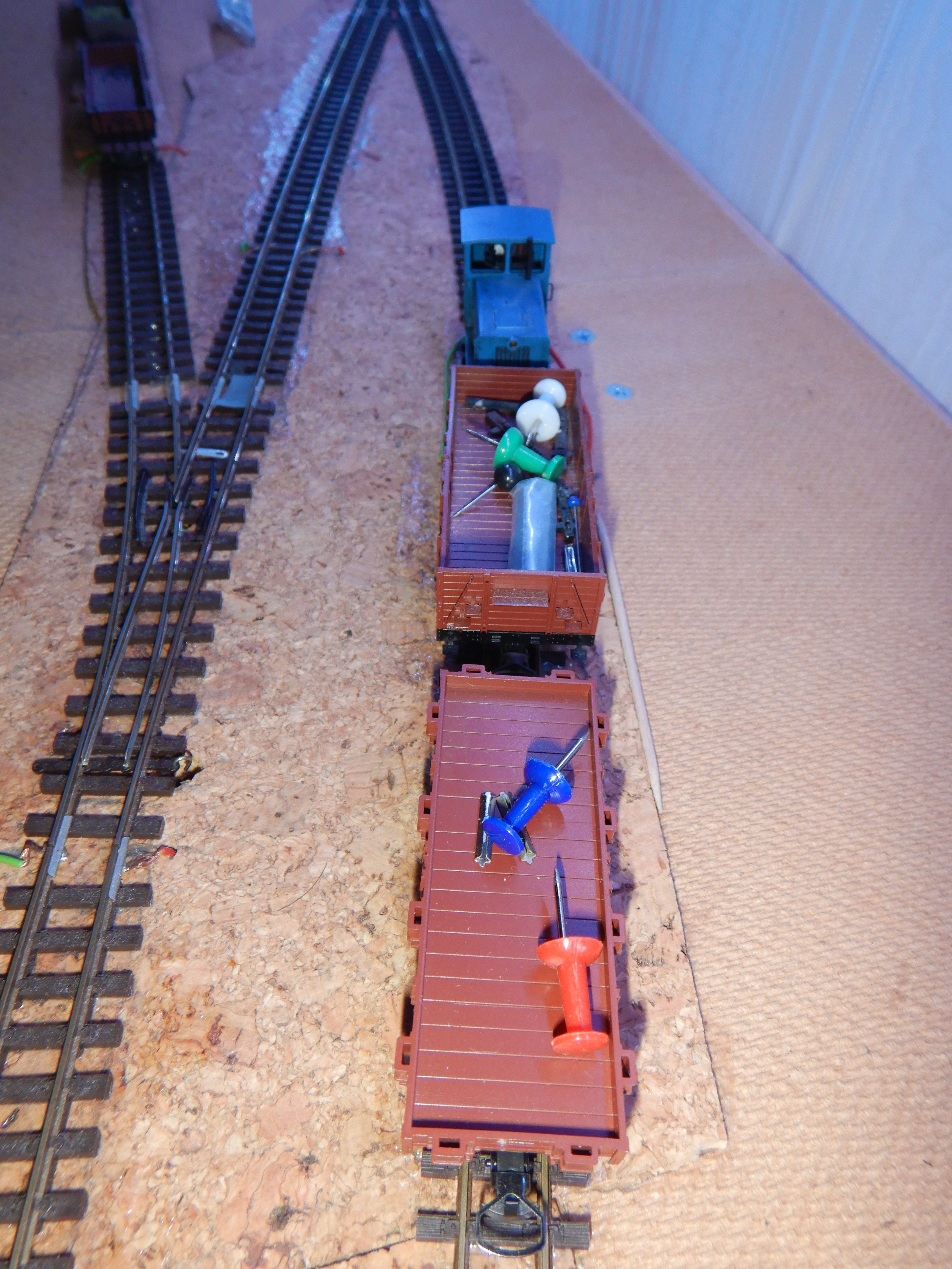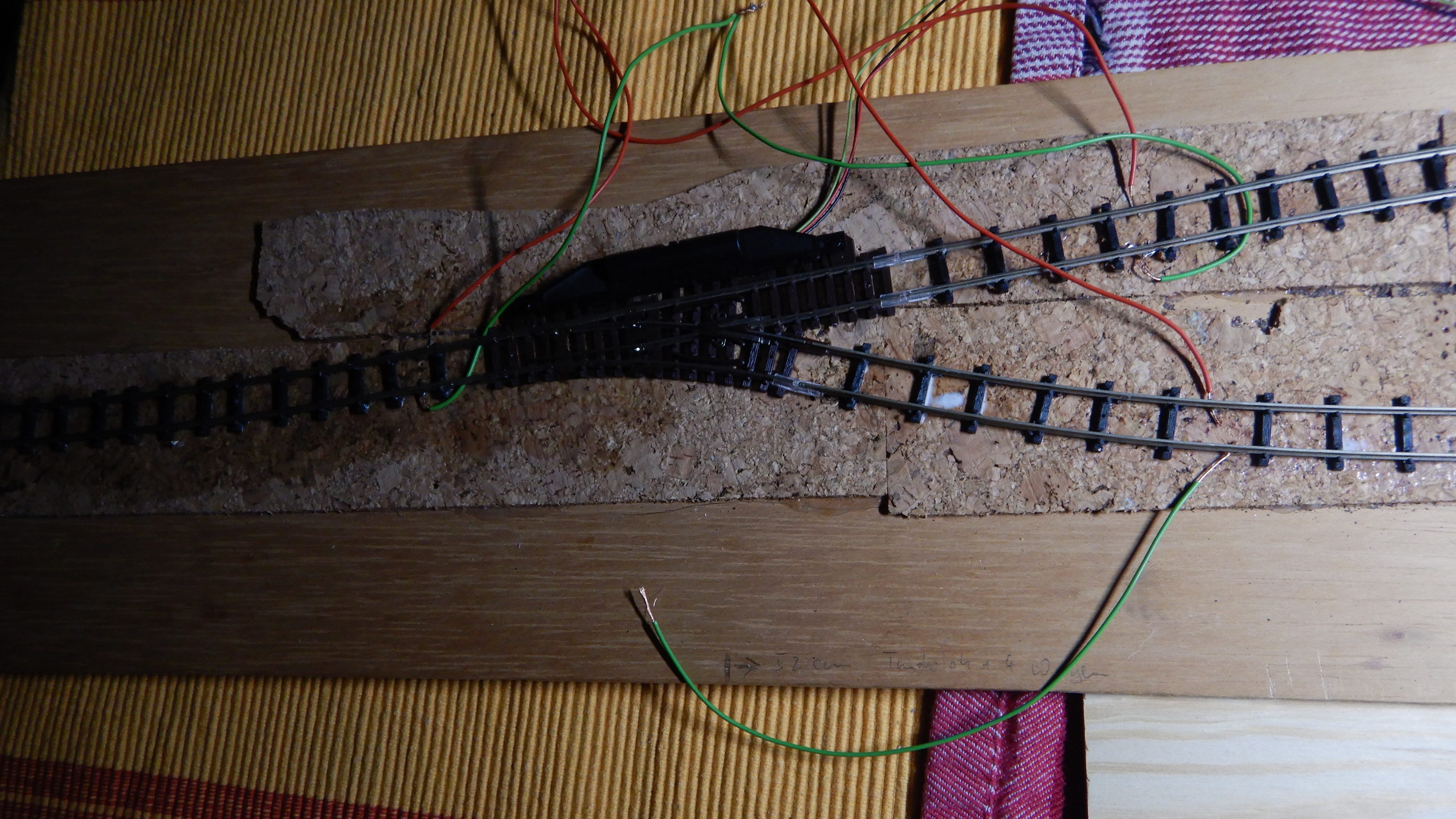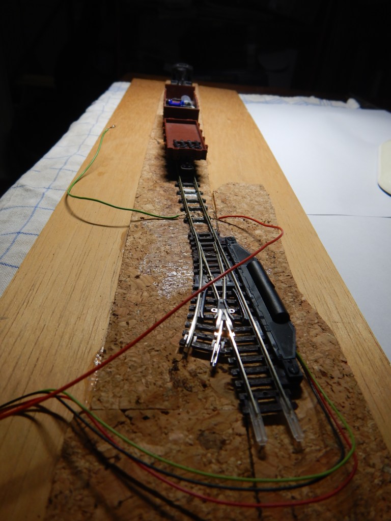 Mit der Verwendung einer elektrischen Weiche aus dem Bereich der Spurgröße N (hat auch 9mm Spurweite) entfällt die Notwendigkeit eines Unterflurweichenmotors (gottseidank). Weiteres Gleismaterial sind ein Stück H0e-Gleis und zwei verformte uralt-Flexgleise der Spur N, die ich mal auf einem Dachboden fand.