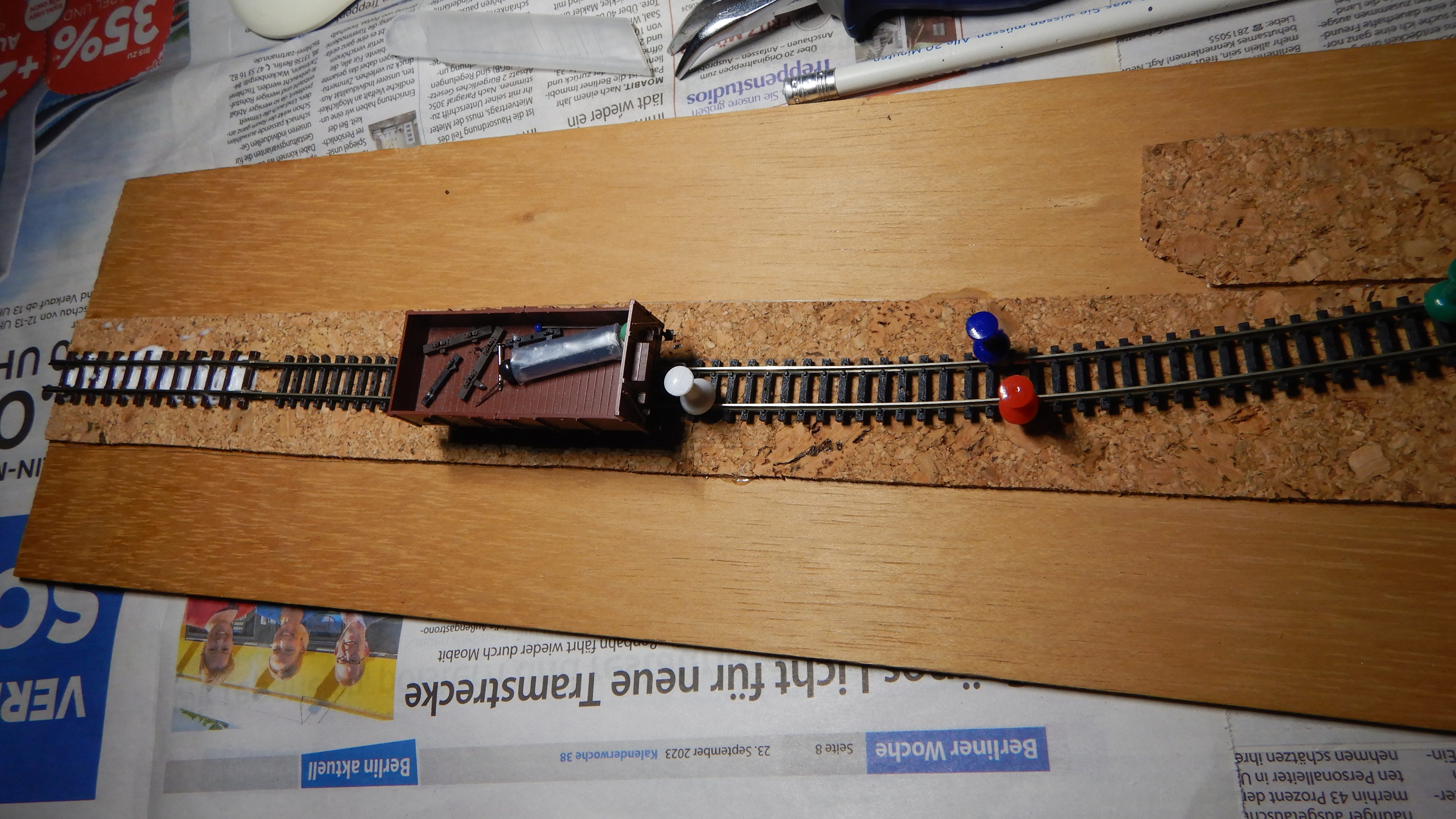 Im Bild oben ist zu sehen, dass ich das einzelne H0e-Gleisstück bereits verklebte. Dies geschah „in-situ“, also am eigentlichen Platz des Segmentes, um einen reibereilosen Übergang zum Bahnhof zu gewährleisten. Der 2-achsige offene Güterwagen dient mir häufig als kleiner Behälter für Stecknadeln oder Kleinzeug, welches beim Bau anfällt, aber nicht weggeworfen werden soll. Sind die Gleise nicht frisch verklebt und sauber, kommt dazu gerne auch eine Zugmaschine.