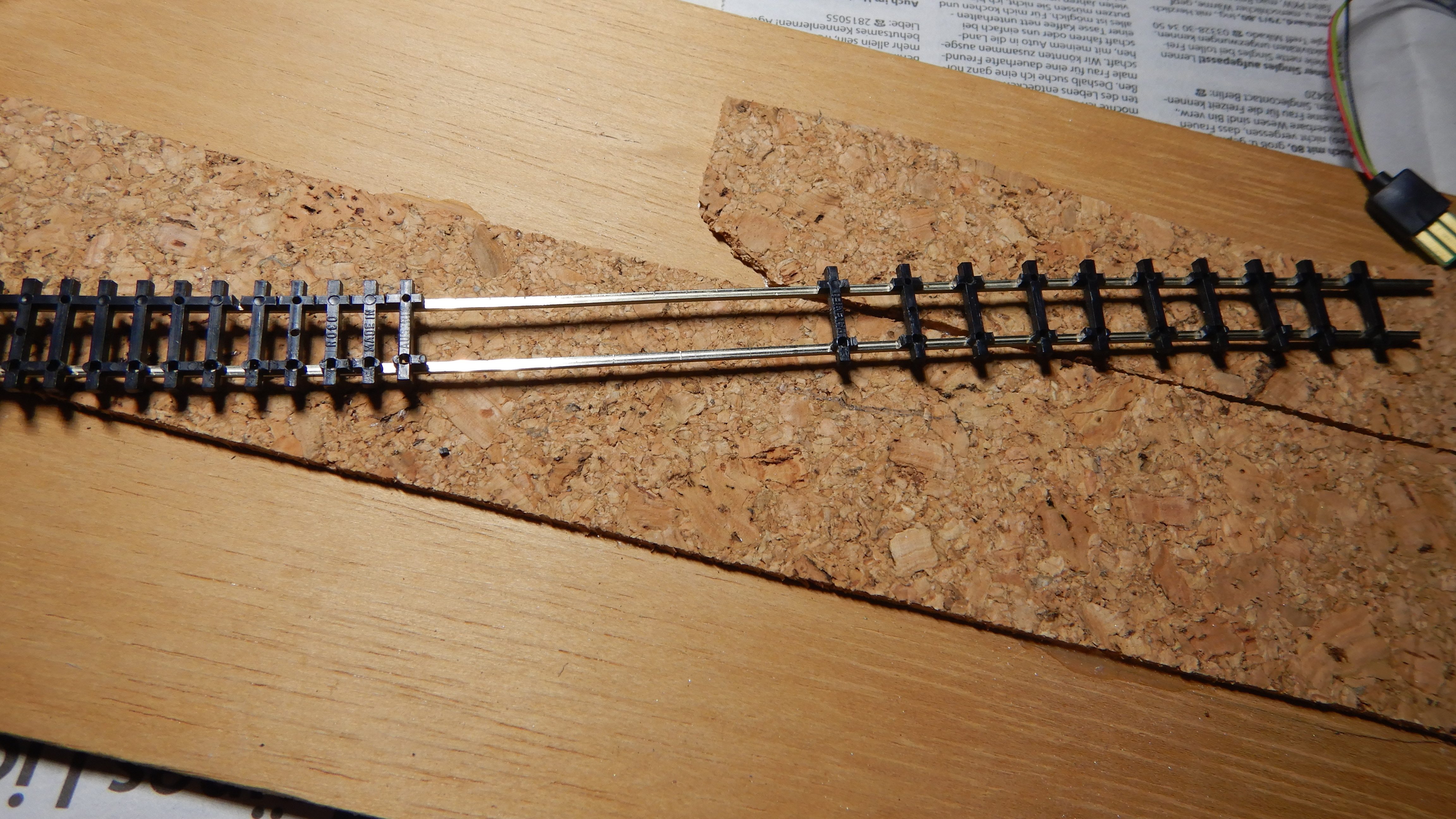 Der zweite Gleisabschnitt des Streckengleises ist verlegt. Auch hier wurden die Schwellen des Flexgleises ausgedünnt und zwei Kabel an das Gleis gelötet.