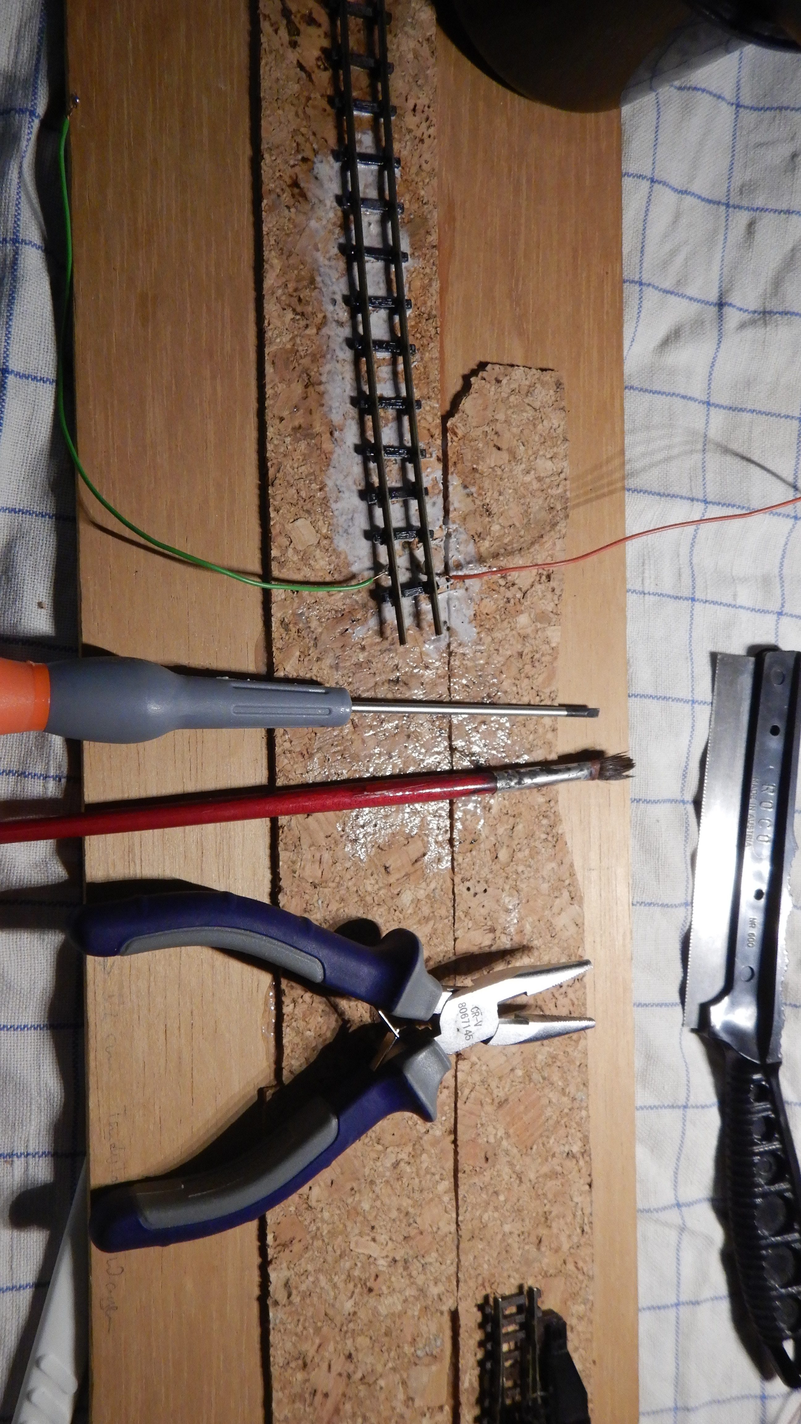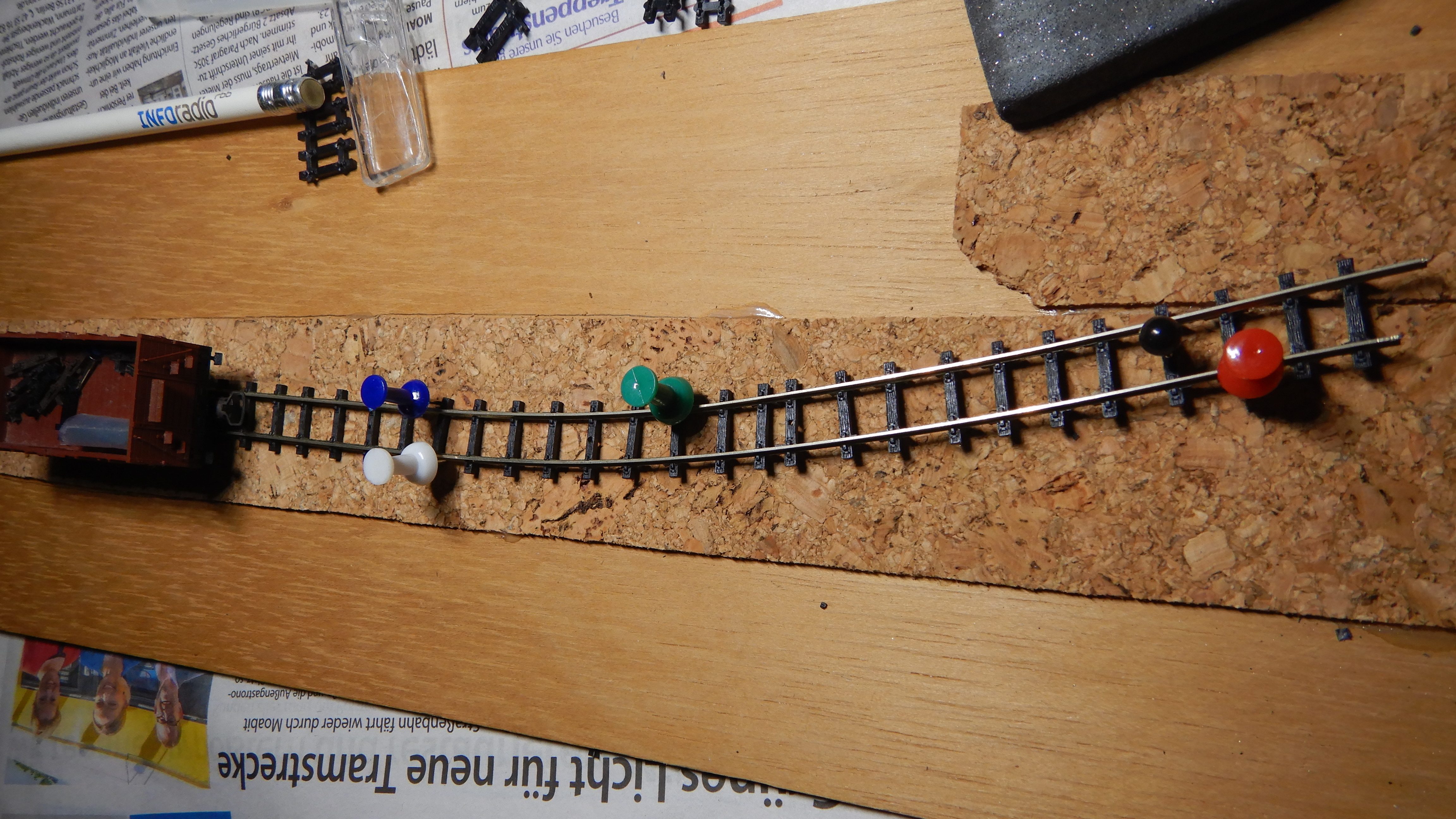 Darauf folgte das erneute Probeverlegen und Zuschneiden der langen und flexiblen Gleisstücke. Diese Gleise lagen wohl bereits auf einer anderen Modellbahnanlage und überlebten den Abriss. Sehr vorbildgetreu. Gleismaterial wurde – und wird – nicht nur bei Schmalspur- und Kleinbahnen gerne wiederverwendet. Feldbahnschienen sind, je nach Bauart, sogar dazu da ortsveränderlich zu sein! The more you know.