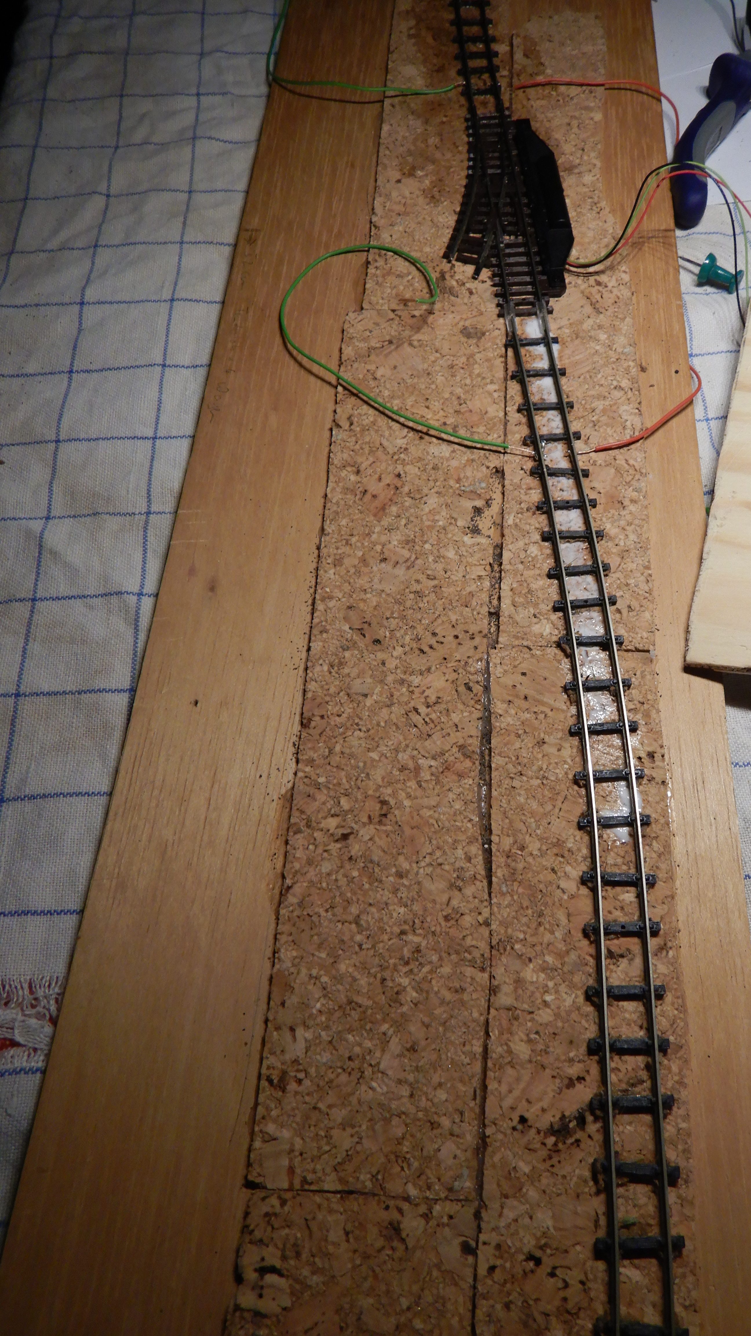 Die Weiche selber wurde nicht nachbehandelt. Sie ist auch nicht mit dem Kork verklebt. Da der Stellmechanismus auch manuell sehr gut funktioniert, hat die Verkabelung und elektrische Ansteuerung derzeit keine Priorität. Beide angeschlossenen Gleise werden von der Weiche elektrisch getrennt und können einzeln zugeschaltet werden.