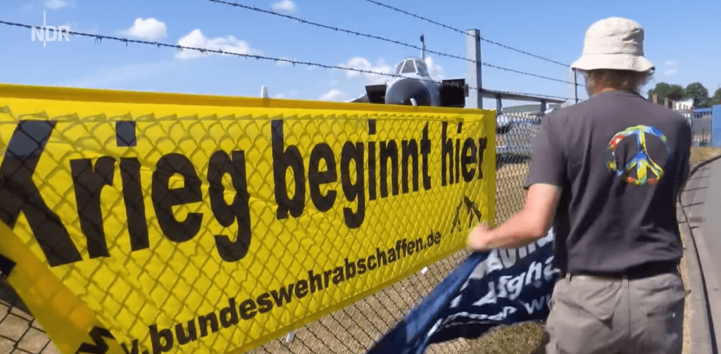 Vor Jahren war es noch absolut undenkbar, dass die Friedensdemonstranten ihre Transparente direkt an den Zaun mit den Schildern MILITÄRISCHER SICHERHEITSBEREICH knüpften. Teilnehmer von Mahnwachen und Friedensdemos wurden durch die Polizei häufiger verhaftet als einige Clan-Mitglieder in Berlin-Neukölln. Auch in der NDR-Doku sieht man die holsteinische Landespolizei stehen.