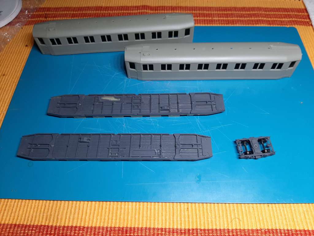 Beide Bausätze werden gleich parallel gebaut. Als erstes nahm ich mir die Drehgestelle und Wagenböden vor und bemalte sie mit Pinsel und Acrylfarbe grau. Verwendet wird hier REVELL Panzergrau, was mein Standardgrau für den Unterbau von Rollmaterial ist. Das war außerdem eine schöne kleine, zeitbegrenzte Aufgabe, während die sozialistische Versorgungsorganisation ein exotisches Abendessen hoher Qualität für die Werktätigen des VEB Schwarzer Kaffee zubereitete.